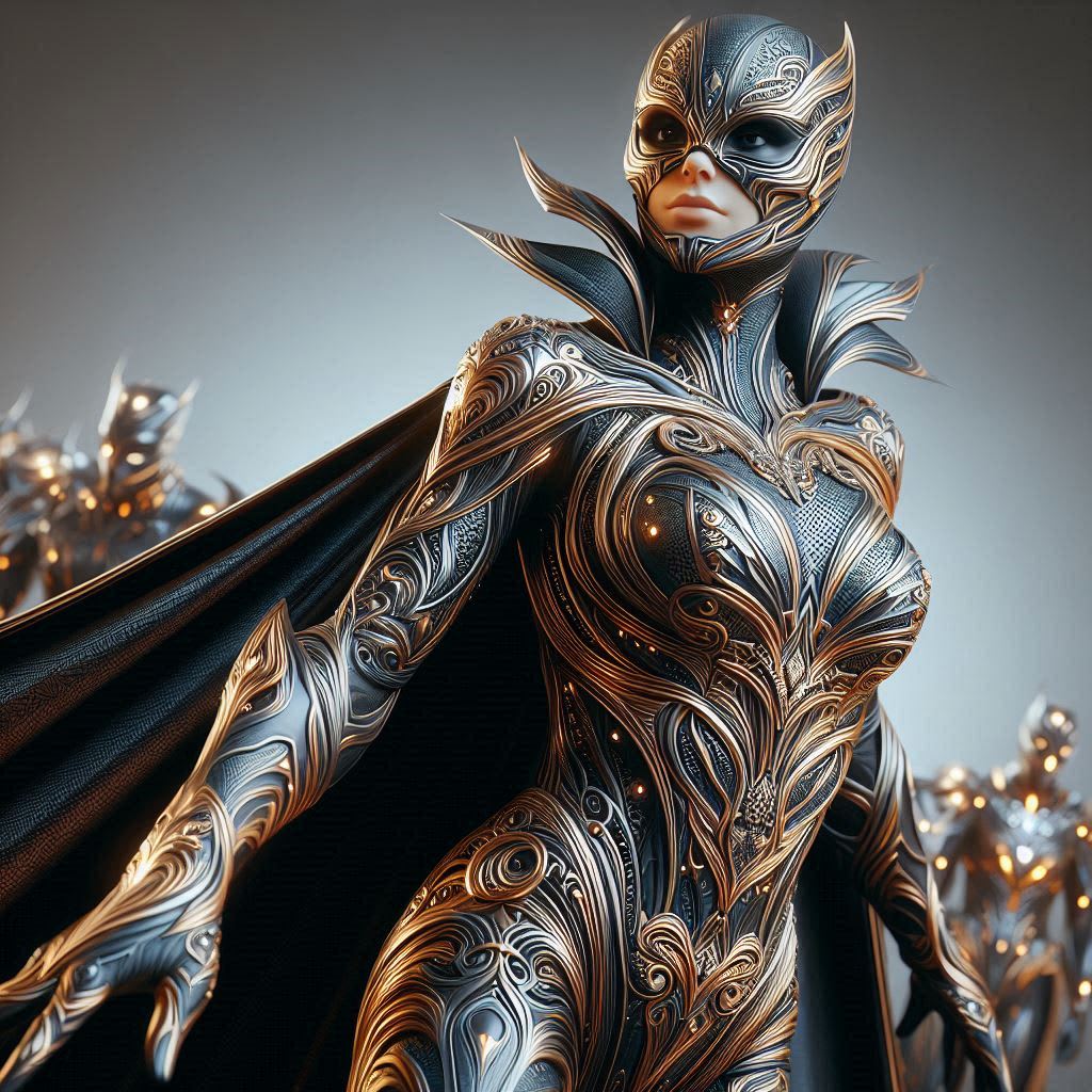 Lumina’s origin was as unique as her abilities. During a groundbreaking experiment, Aiko’s life was irrevocably changed when she fused with an ancient artifact. This fusion endowed her with incredible powers, blending advanced technology with mystical relics. Lumina could manipulate light in astonishing ways, from blinding her enemies temporarily to altering the physical state of objects, making them either solid or non-existent. Her metallic bodysuit, a sleek silver adorned with flowing blue lines, symbolized her mastery over light and her connection to the scientific community.