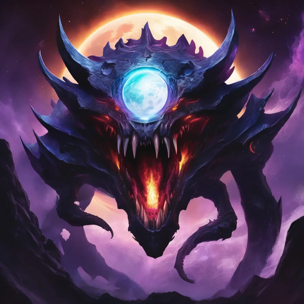 In the vast reaches of space, where even the bravest explorers dare not tread, a dark legend stirred—an entity known only as the Eclipse Maw also know as the Devourer. This celestial being was whispered about in the hushed tones of starships and among the wisps of cosmic dust, a shadow moving unseen through the boundless dark.