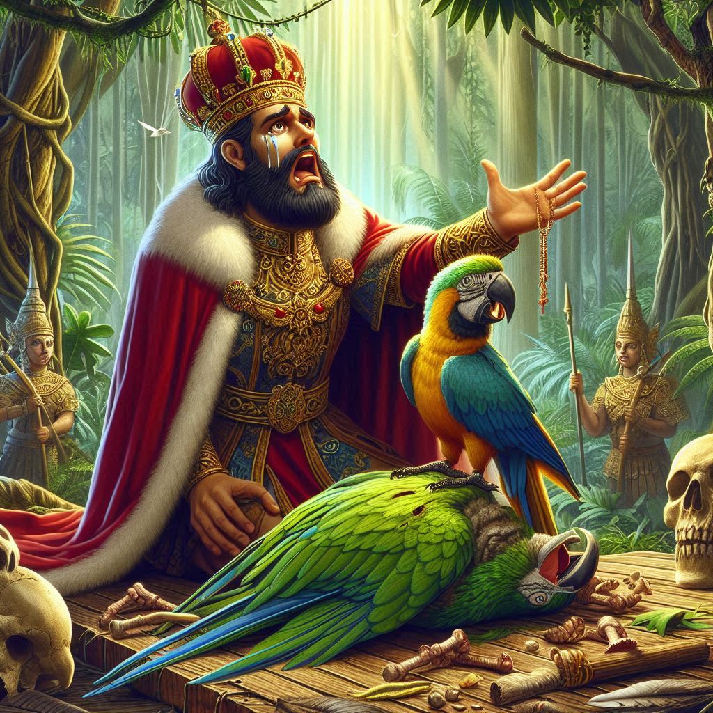 Now the king became angry out of frustration and said that I am very thirsty, I am collecting water with so much hard work and this evil bird comes and spoils all my hard work, now I will not leave it, when it comes back I will kill it. Thus the king takes the whip in his hand and starts filling the bowl again. After a long time, the bowl is filled with water. Then the king lifts the bowl to drink and the parrot again starts making the sound 'ten ten' and comes near to snatch the bowl. The king hits the parrot with the whip and the parrot dies right there. Then the king thinks that he has got rid of the parrot but when will he be able to fill the bowl again with these drops and when will he be able to quench his thirst. So he goes to the branch from where the water is dripping and fills it quickly. Thinking this, the king goes to the branch from where the water was dripping. When the king goes there and looks, the ground beneath his feet slips away. Because a terrible python was sleeping on that branch and saliva was dripping from the mouth of that python. What the king thought was water was actually the poisonous saliva of the python. A sea of remorse rises in the king's mind that O Lord! What have I done? The bird which was repeatedly saving me from drinking the poison, I killed it out of anger.