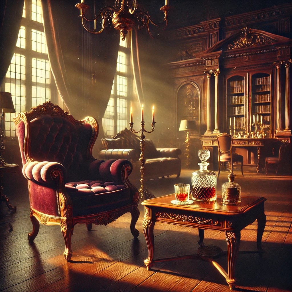 Charles led him through the maze of corridors, finally stopping at a set of double doors that opened into a room filled with soft light and a distant, lingering melody—a music box, perhaps, playing in the background. The Baroness was seated by a grand fireplace, her silhouette regal in the flickering flame’s light. Her eyes, sharp as ever, turned to meet his gaze as he stepped inside.