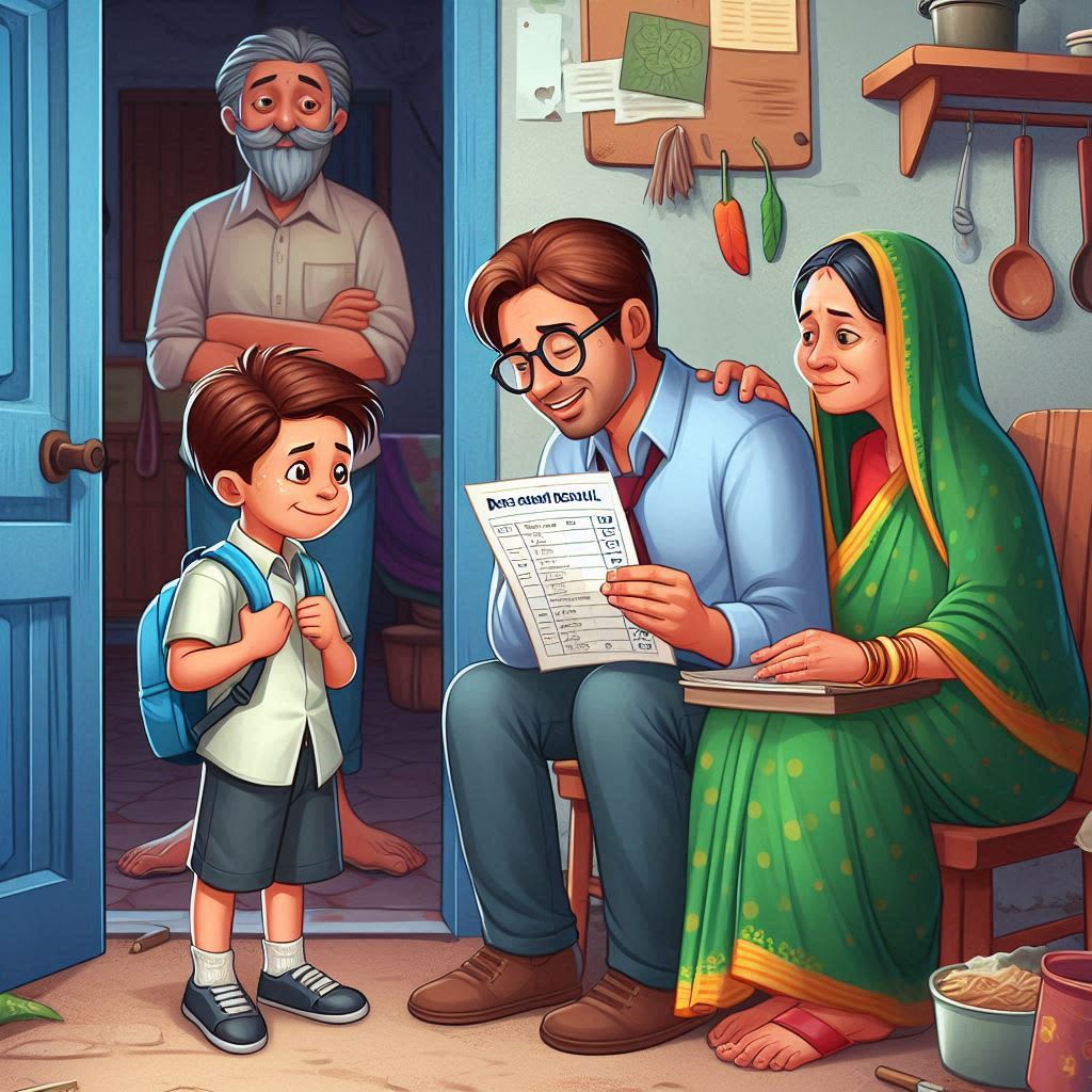The father happily saw the mark sheet and told his wife to make sweet porridge, your darling has scored 90% marks in the school examination!