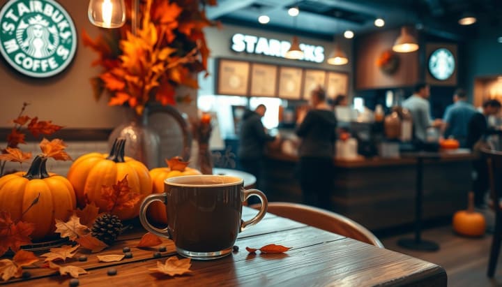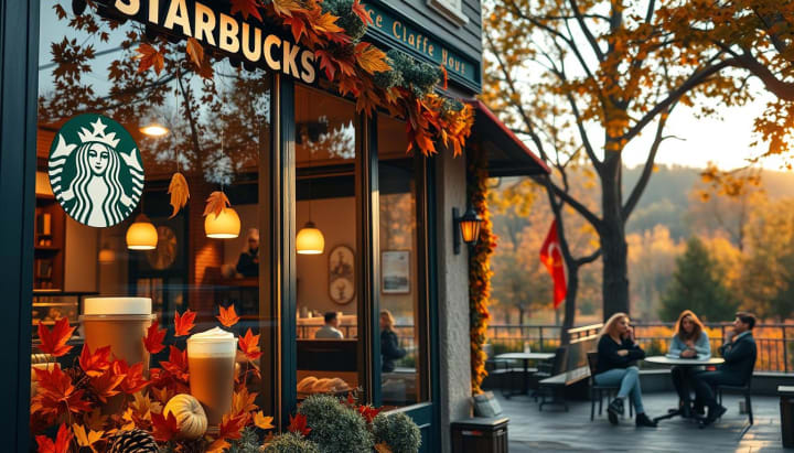 A cozy Starbucks storefront is adorned with autumn decorations. It features a warm, inviting ambiance. The scene showcases a pumpkin spice latte and seasonal pastries displayed prominently in the window, surrounded by colorful fall leaves.