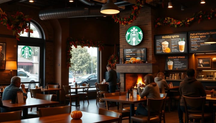 A cozy Starbucks coffee shop is adorned with fall decorations. It has a warm ambiance with wooden furniture and autumnal colors. There's a glowing fireplace in the corner and a festive coffee menu board.