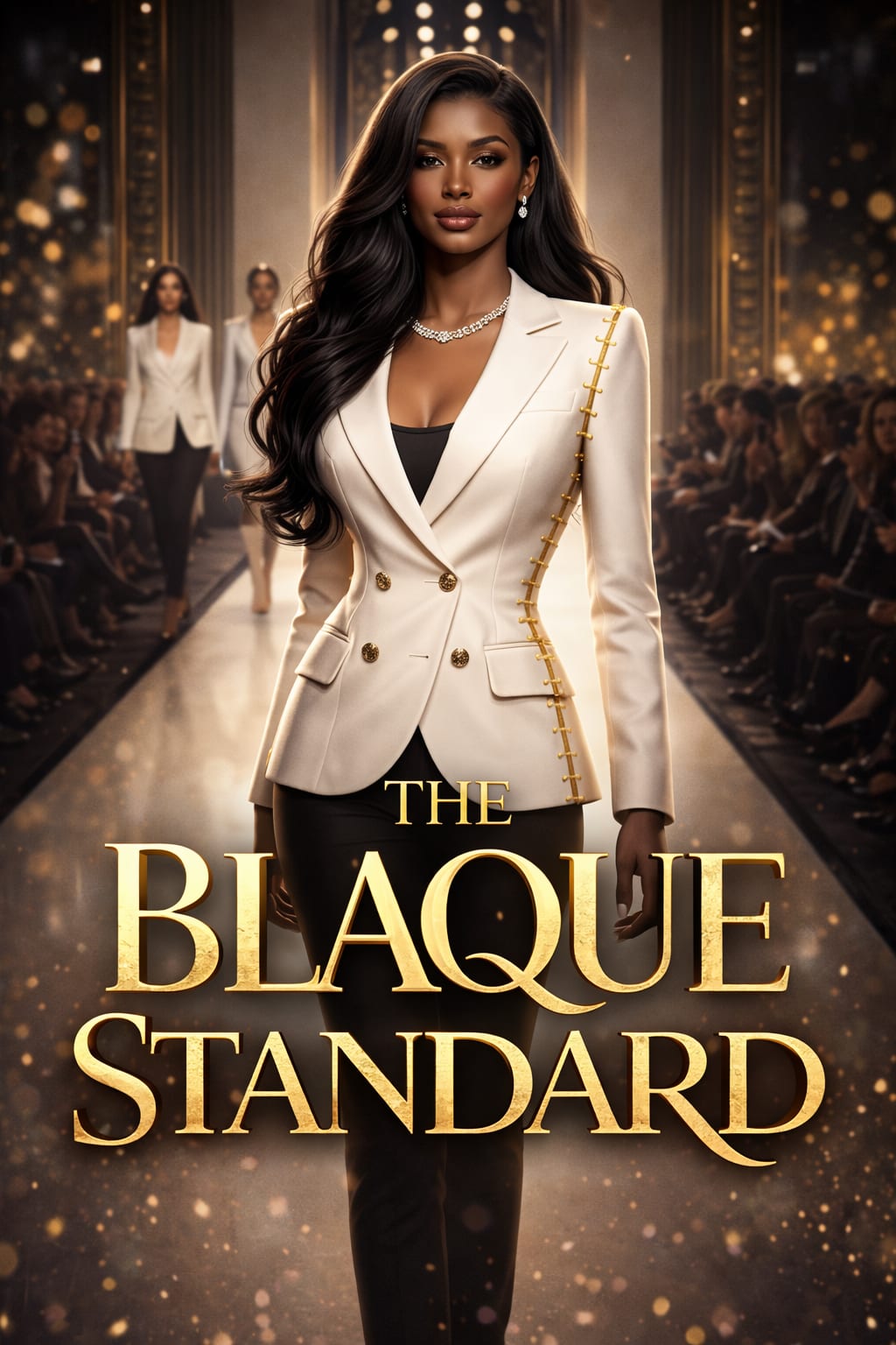 Shoulders lifted. Waist carved. Silk in muted gold beneath.