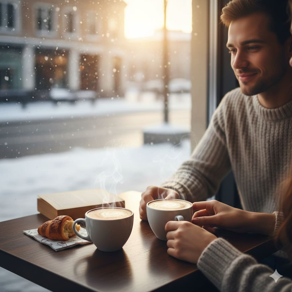 Snow fell lightly outside, rare for the city. The café was nearly empty.