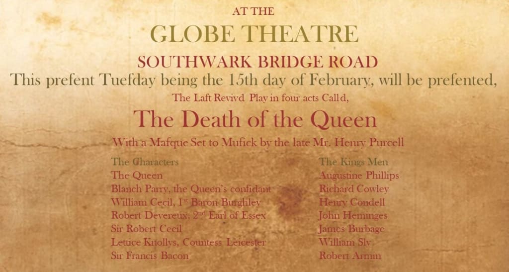 Although it's a little hard to read, please note that the play bill shows that the musical accompaniment for the performance was by Henry Purcell, widely regarded as the greatest of the English Baroque era composers. And for science and philosophy geeks, Sir Francis Bacon is one of the characters!