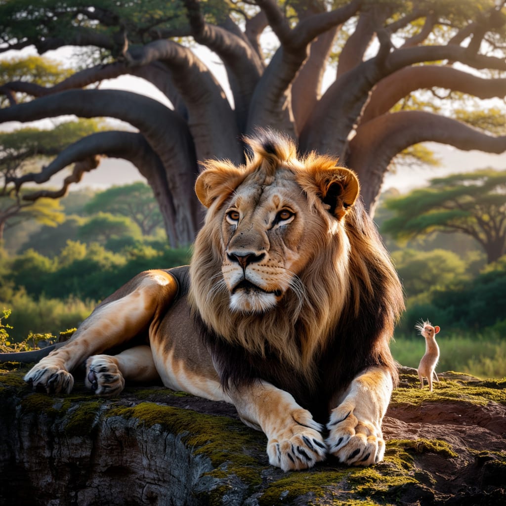 One hot afternoon, after a satisfying meal, the lion stretched out under a shady tree for a nap. The air was still, the jungle quiet, and the lion’s soft snores filled the silence. As he lay there dozing peacefully, a tiny mouse was scampering through the grass nearby, searching for food.