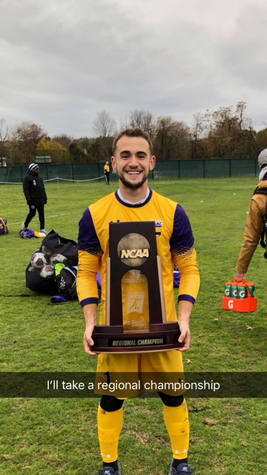 Charleston’s game plan became a lot more direct as we got closer to full time. They were no longer looking for their perfect ball through the backline. Shots were taken from as far out as 25 yards, a major difference from the first half. It was so intense and just kept building. I feel like I didn’t fully exhale until the ball went out for a West Chester goal kick with 10 seconds left in the game. Because in that moment, we knew for sure that we’d pulled it off. Right after the final whistle, we lifted the Atlantic Regional trophy, a trophy that no longer exists because of changes to the format of the Division II National Tournament.
