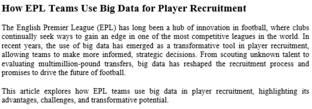 The English Premier League (EPL) has long been a hub of innovation in football, where clubs continually seek ways to gain an edge in one of the most competitive leagues in the world. In recent years, the use of big data has emerged as a transformative tool in player recruitment, allowing teams to make more informed, strategic decisions. From scouting unknown talent to evaluating multimillion-pound transfers, big data has reshaped the recruitment process and promises to drive the future of football.
