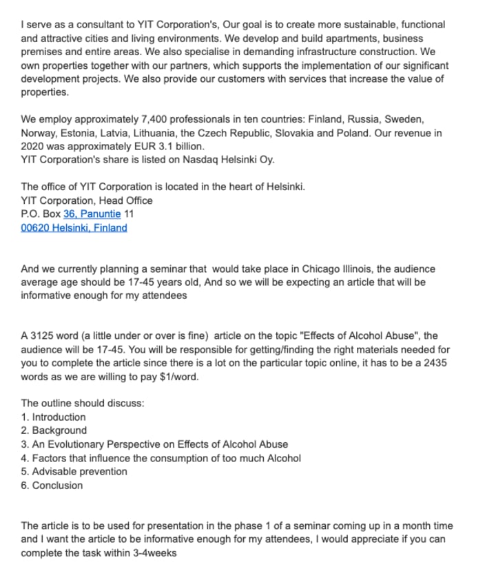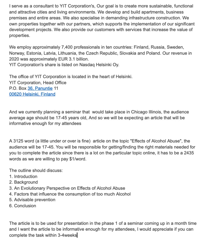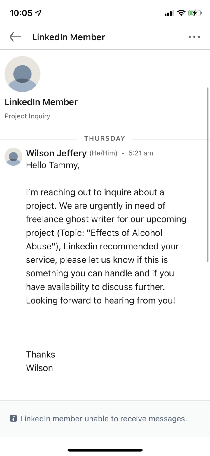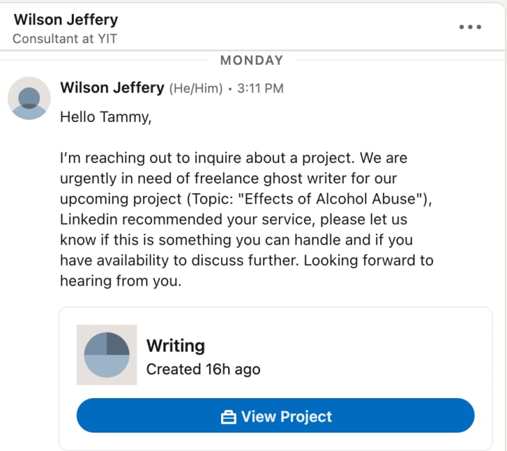 “I’m reaching out to inquire about a project. We are urgently in need of a freelance ghostwriter for our upcoming project (Topic: "Effects of Alcohol Abuse"), Linkedin recommended your service, please let us know if this is something you can handle and if you have availability to discuss further. Looking forward to hearing from you.”
