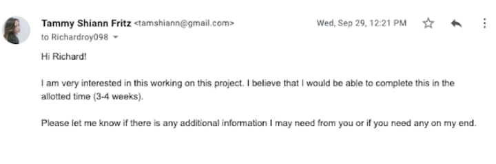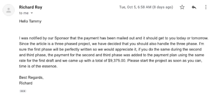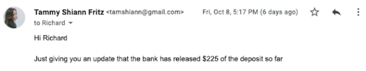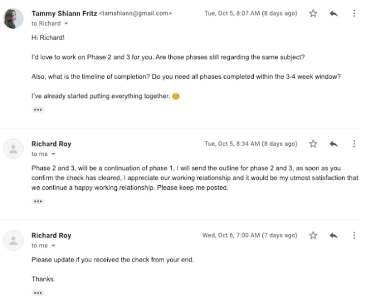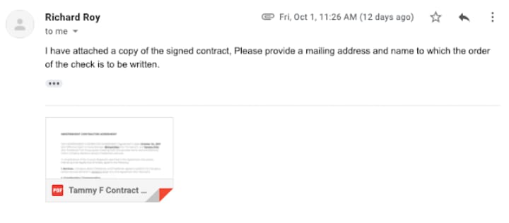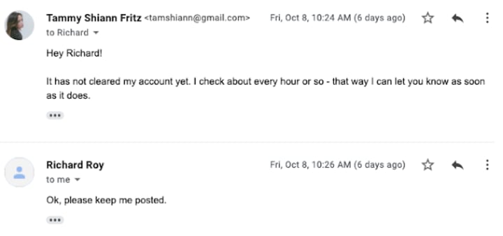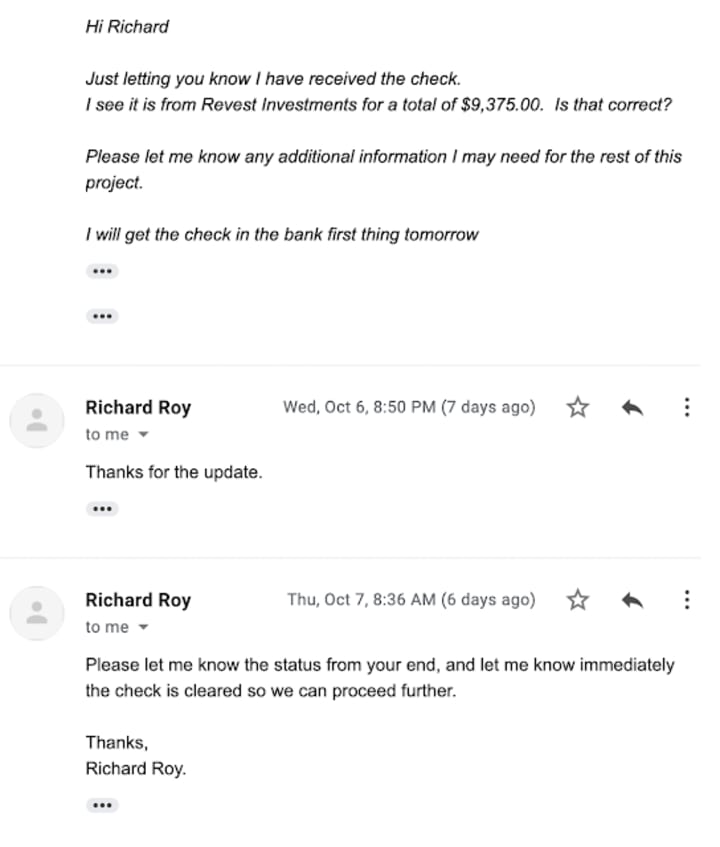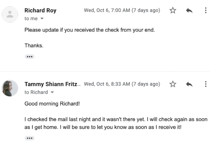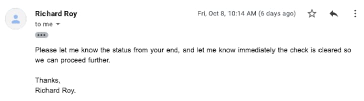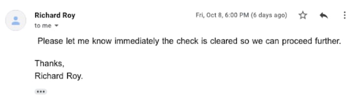 October 6th, 2021 - the following morning I have an email from “Richard” asking if I had received the check, I hadn’t yet but planned on checking the mail when I got off work.