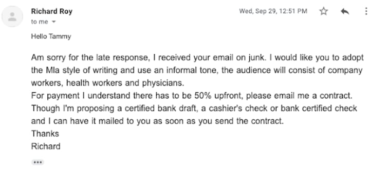 I would like to mention that Richard first mentioned the upfront payment, I did not. Being new to freelance writing - I googled if it was normal to receive an upfront payment for a project - according to my search, it seemed like a normal part of the process...based on prior work/references...which this guy had not seen.