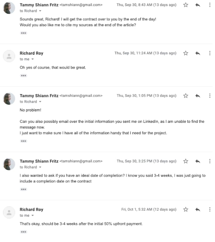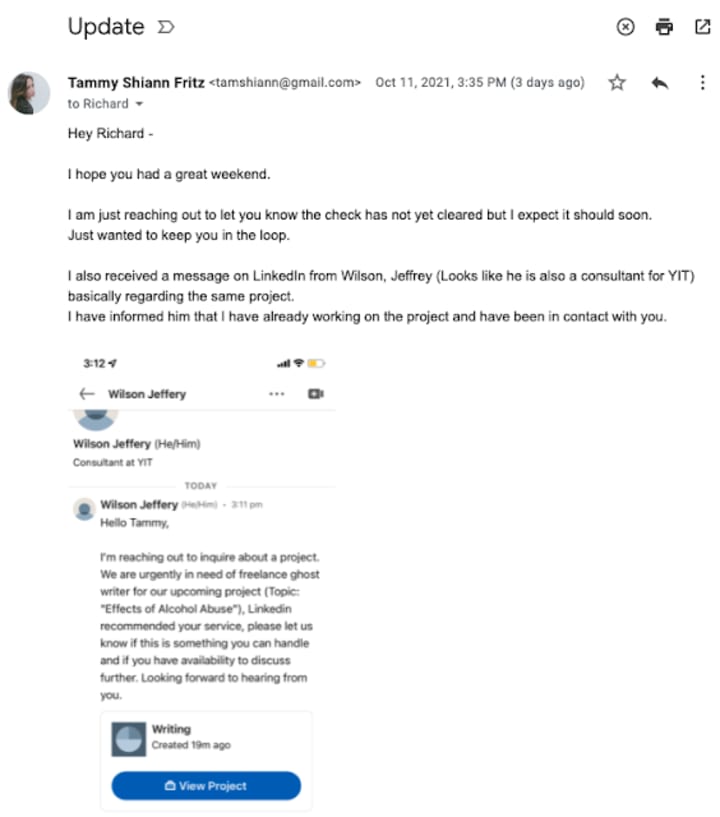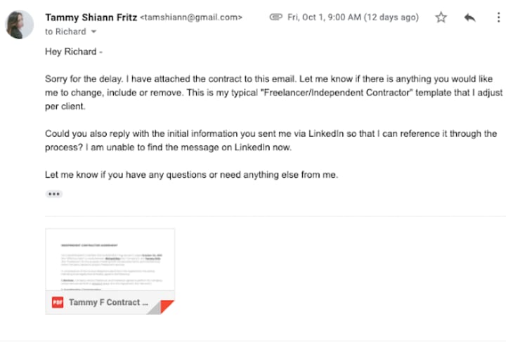 The following day I noticed that my and Richard’s messages on LinkedIn had disappeared from my inbox. (This is why I do not have actual screenshots of Richard's original LinkedIn messages) I searched through my inbox using all the filters, checking archived and deleted messages. They were nowhere to be found. I chalked it up to a glitch in LinkedIn’s system or a possible feature of LinkedIn I wasn’t aware of.