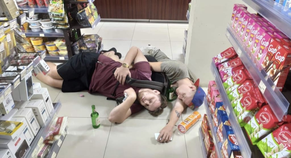 So I walk into school on Monday morning into the staff room around 7:15, still feeling the repercussions of a 3 day bender. Anyways, two of the ladies I work with are huddled together and when they look up and see me,they burst out laughing. I’m a little confused but still half asleep. The one says:’ Do you remember Saturday night, Tim?’ I laugh a bit, thinking someone had told them about the night and us getting rowdy. This is when she turns her phone towards me. And there, sprawled on the floor of a circle K at 3am is Ben and I, spooning. Out cold. Turns out, this lady’s husband runs a bar and they were coming home from work to their local Circle K to get some snacks. Ben and I are passed out sleeping in the middle of an aisle. Soju and pringles by our side. So she tells me that they walked in and saw us canoodling and tried to wake us up for ages, kicked us a little but nothing. Eventually, as they were leaving they tried again and we woke up, apparently Ben took one look at them and just bolted as fast as he could up the road. Apparently I chase after Ben, drunkenly drag him back and promised to get us home. And we obviously climbed on our bikes and got home. Both of us, to this day don’t remember what the hell happened or how or why we were even in a Circle K and WHY did the dude working there let us sleep there. What’s worse is our Head of School got shown the photo and we got hauled into his office and promptly told if any parent or member of the board got wind of this that there was nothing he could do for us. Luckily they did not and to this day I remain a professional and an educator of children.