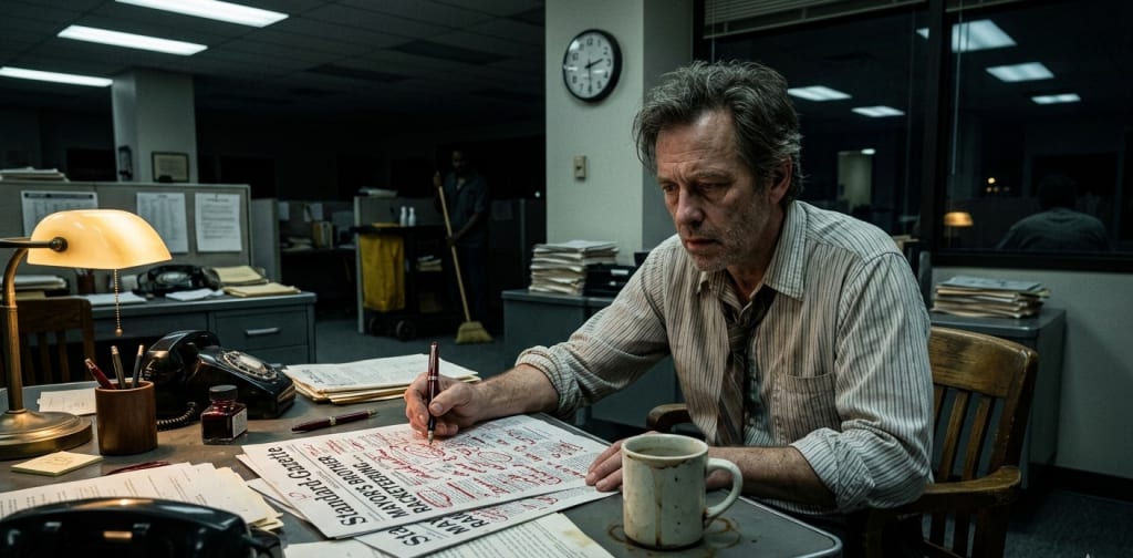 The clock on the wall of the Standard-Gazette newsroom didn’t tick; it thudded, a heavy, rhythmic reminder that Arthur Penhaligon was officially out of time.It was 3:14 AM. The fluorescent lights overhead hummed with a sick, flickering yellow energy that made the bags under Arthur’s eyes feel like lead weights. On his desk sat a ceramic mug—once white, now stained with a permanent ring of tannin. He took a sip. The coffee was stone cold, a bitter oily film coating his tongue. It tasted like failure and long division.Beside the mug lay the galley proofs for the morning edition. They were hemorrhaging.Arthur held a fountain pen gripped so tightly his knuckles were white. The ink was a shade of crimson called "Oxblood," and he had used it to eviscerate the lead story. Great sweeping strikes crossed out adjectives; jagged circles trapped grammatical errors like flies in amber. But the red ink wasn't just for style tonight. It was for survival."You’re bleeding it dry, Artie," a voice rasped from the shadows of the cubicle row.Arthur didn’t look up. He knew the scent of cheap cigars and peppermint anywhere. It was Elias, the night janitor, a man who had seen more scandals swept into dustpans than Arthur had ever printed."The truth is messy, Elias," Arthur muttered, his pen hovering over a paragraph that implicated the Mayor’s brother in a construction racketeering scheme. "It needs to be precise. If I miss one comma, the lawyers will have us for breakfast. If I miss one fact, I’ll be looking for a job at a greeting card company by noon.""You’ve been 'precise' for twelve hours," Elias said, leaning on his broom. "At some point, you're just stabbing the paper."Arthur finally looked up. His reflection in the dark window across the room looked like a ghost—gaunt, grey-skinned, and haunted. "I found a discrepancy."He pointed his red pen at the ledger notes he’d been cross-referencing. The ink there was different. It wasn't his. Someone had been in his office while he was at dinner, and they had made their own "corrections." Someone had tried to sanitize the blood out of the story, and they had used a red pen that matched his exactly."Look at this," Arthur whispered, his voice cracking. "The numbers in the second paragraph. They’ve been shifted by a single decimal point. It looks like a typo. It should be a typo. But $1.2$ million becoming $12$ million changes this from a local bribe to a federal conspiracy."Elias stopped leaning and stepped closer, his eyes narrowing. "And you didn't change it back?""I can't," Arthur said, gesturing to the cold coffee. "The editor-in-chief signed off on this version five minutes before he bolted out the door. If I change it back to the truth, I’m 'sabotaging' the paper. If I leave it, I’m publishing a lie that will ignite a firestorm the city can't put out."The silence of the newsroom felt heavy, like the air before a lightning strike. Arthur looked at the red ink on his fingers. It looked remarkably like the real thing. He realized then that the "Red Ink" of the title wasn't just about editing—it was about debt. The debt of the truth.He looked at the cold coffee, then at the clock. $3:22$ AM. The press started rolling at $4:00$."You know," Elias said softly, "sometimes the only way to fix a mess is to knock the whole bottle over. "Arthur looked at the bottle of Oxblood ink sitting precariously near the edge of the desk. He looked at the galley proofs. He thought about the years he’d spent chasing the perfect sentence, only to realize that the most powerful thing he could do wasn't to write—it was to erase.He didn't pick up the pen. Instead, he picked up the mug. He swirled the cold, dreg-filled liquid one last time."I'm not an editor anymore, Elias," Arthur said, a grim smile finally touching his lips. "I'm a witness."He stood up, grabbed the red ink, and headed toward the elevator that led down to the printing press. The coffee stayed behind, a cold monument to a career that was about to end in a very loud, very public explosion of ink and paper.