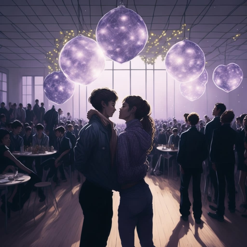As the night draws to a close, Jake takes Lily by the hand and leads her outside, away from the noise and the crowds. They stand under the stars, their breaths visible in the cold air.