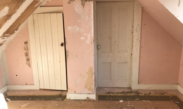 I checked out the attic space above the main house, just for a look-see. It was accessible from the hatch in the bathroom and the wooden ladder that lived beside the bathtub. Poking my head up into the space, there was a window at each end, no floorboards. Dust motes (probably filled with old mouse poo) floated through the air giving everything the look as though I was the first to enter this space in a very long time. Under the dust, I found two prints on paper of early 1900's florals and a woman with flowers. There was a bamboo easel with brass end caps. These were much older than the items found in the back attic. I wonder what else hides underneath the thin layer of insulation between the joists? One day I may find out. Or they may be hidden there forever.