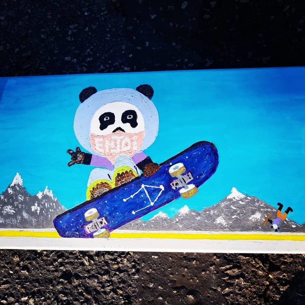 They got to the skate shop and browsed for the parts needed to have her board rolling smooth. Daniel found out that it was about the same price if he just bought her a new board, so he did. On the way back to the apartment, Dana told him that she was going to fail 7th grade this year unless she went to summer school as part of the 'No child left behind' program. Daniel considered what she had been going through, but still felt disappointed that he bought her the board because it seemed she wasn't trying hard enough at things. He thought about what kind of influence Andy was, and how toxic he was for her. Daniel came up with a compromise. The board was pretty plain, so he had in mind to give it a custom paint job. He told her that she would have to earn the board by getting through summer school so she wouldn't flunk the 7th grade. Although she was disappointed, Dana agreed. She then instructed Daniel to make sure to keep the Enjoi name on the board. He recognized someone's desire to fit in by having something that was in style, and would do this for her somehow.
