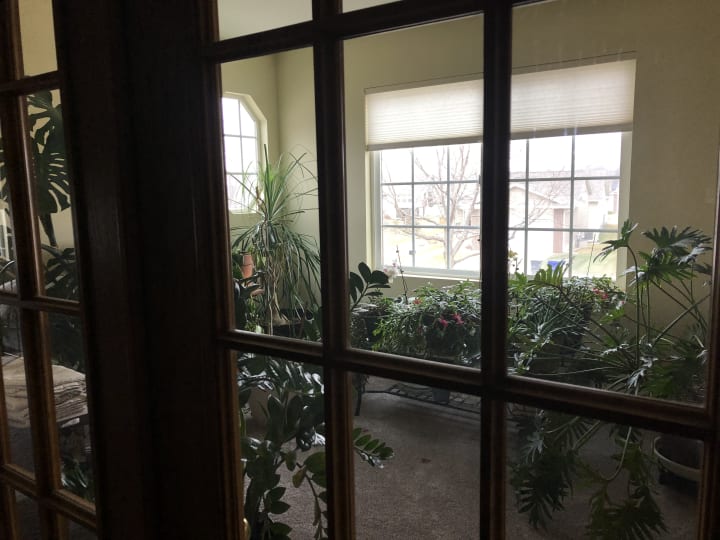 That room, as you know, is a jungle. Linda takes care of all the plants that include rubber trees, palms, orchids, and winter blooming cactus.