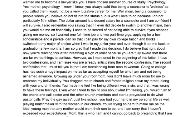 Hey Mom, Happy Mother’s Day first and foremost because like you always said “give me the good news first, so that the bad news won't bother me so much”. So with that being said, I love you with all my heart and soul and thank you so much for being there for me. I have two confessions that I must get off my chest. I thanked you earlier for being there for me, but I feel like what I have done I know you would not only disapprove of but disown me altogether. The first confession I want to reveal is that although I am in my final semester of my Senior year at Chattanooga State, I am not attending under the same course of study that you wanted me in, which you wanted me to become a lawyer like you. I have chosen another course of study: Psychology. Yes mother, psychology. I know, I know, you always said that being a counselor to 'weirdos' as you called them, would not be a very lucrative career for me. Well mom, being a counselor to people whom you believe do not fit into the status quo is what I love to do because I do not particularly fit in either. The dollar amount is a decent salary for a counselor and I am confident I will survive. I also remember you saying that if I ever did decide to switch to another major, then you would cut me off financially. I used to be scared of not being able to survive if you stopped giving me money, but after working one full- time job and two part-time gigs, applying for a few scholarships and a private loan so that I can pay for my own college tuition and books. I switched to my major of choice when I was in my junior year and even though it set me back on graduation a few months, I am so glad that I made this decision. I do believe that right about now your reading this letter, breathing a sigh of relief because you are fully aware that there are far worse things to confess. However, as I mentioned in the beginning of this letter, I have two confessions, and I am sure you are already anticipating the second confession. The second confession that I must to tell you is that I am transitioning from man to woman. Going to college has had such a huge impact on me as far as accepting myself for who I am and not be ashamed anymore. Growing up under your roof mom, you didn't leave much room for me to embrace my individuality. You dragged me to church and forced religion down my throat, along with your church friends. You made me feel like being different was a sin, and that I was wrong to have these feelings. Even when I tried to talk to you about what I'm feeling, you would rush to the phone and call pastor and the other church members and start a prayer/fast to do what pastor calls 'Pray the gay away'. Just like school, you had your hand in my personal life as well, playing match maker with the women in our church. Your trying so hard to make me be the ideal young man that any mother would want their son to be, and I am sorry that I haven't exceeded your expectations. Mom, this is who I am and I cannot go back to pretending that I am happy when I am not, even if you are happy.