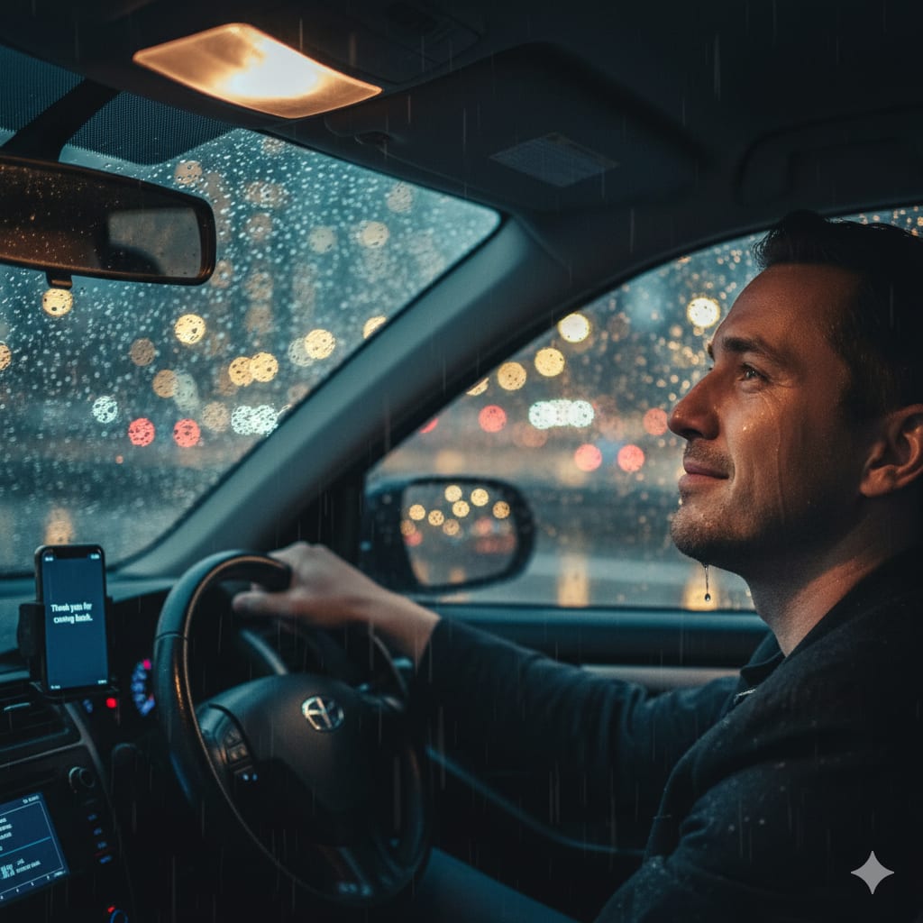 That night, as I drove home, the city lights blurred in the rain.
