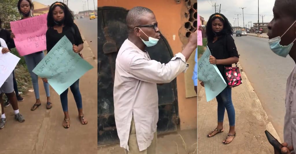 A video that has since gone viral, a Nigerian man is seen in front of a house confronting a small gathering of women who are protesting against rape.