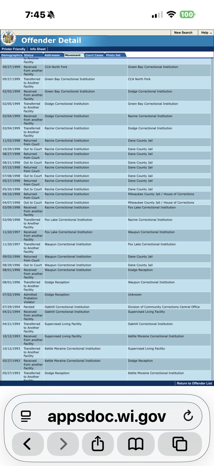 • Cross-state transfers, including periods under Minnesota DOC, overlap with gaps in public documentation.