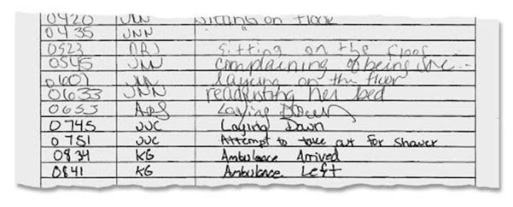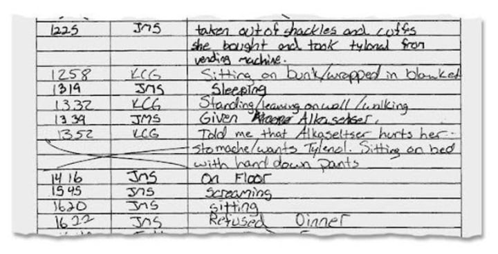 She was placed in solitary confinement and shackled and double-locked to a cell after this incident. The guard alleged that she ‘refused to get up.’ Guards placed her in solitary confinement because she refused to stop banging on the door. Her pain became so noticeable inmates had come together to try to help her. Guards said it caused a disturbance when the inmate bought Tylenol from a vending machine and alerted guards to her situation, although they heard and saw the woman’s condition. Staff offered her Alka-Seltzer, but refused her any further medical attention.