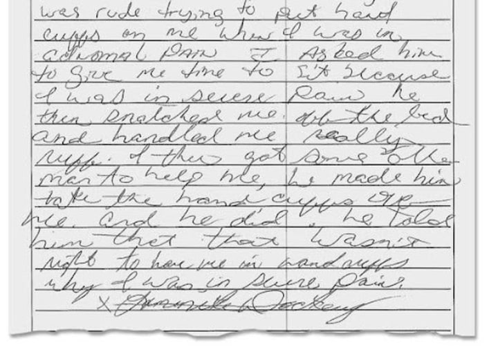 The above and following photos show a complaint made by Ms. Dockery after she was shackled to a bed.