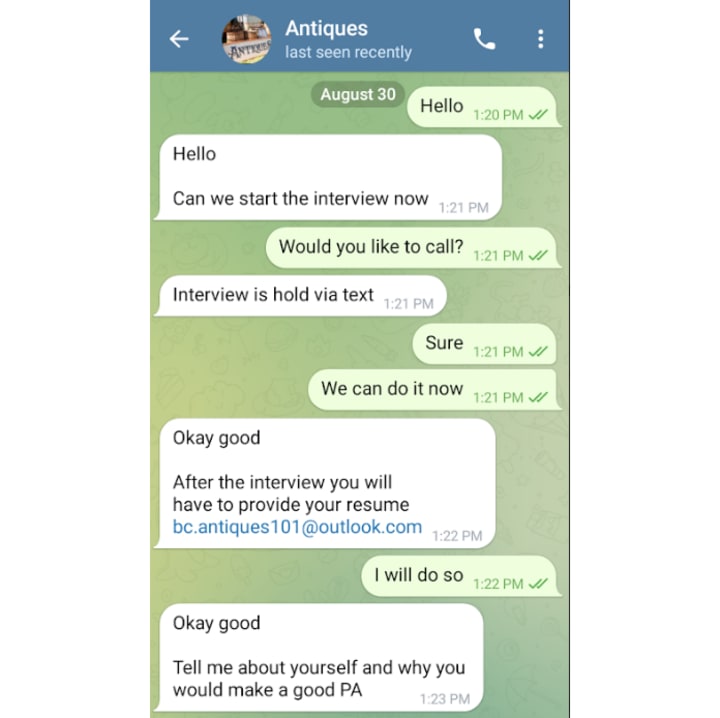 The next day around noon there’s a message on Telegram. First, I needed to open a new @gmail address, then I needed to create a Draft of Apology letter which would say: “My sincere apology for the delay in responding to your inquiries. You will receive an Amazon gift card as a token of appreciation for your patience. Due to overwhelming amount of work I had to hire a PA to help me with customer relations. All communication will go now through PA”.