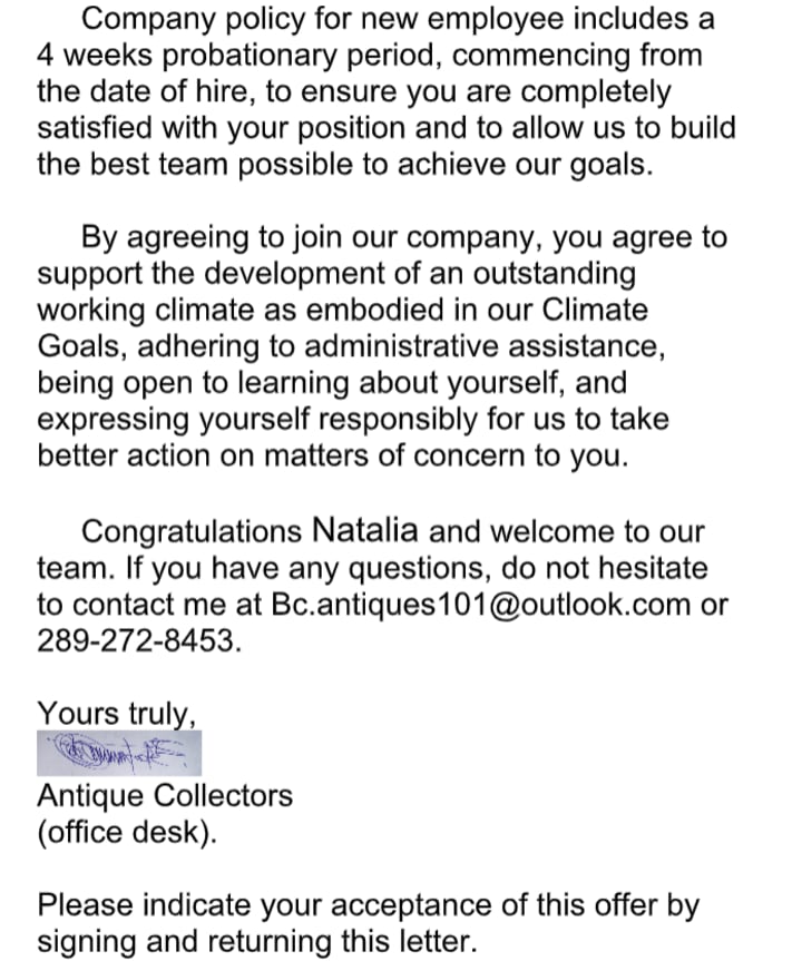 Within minutes I received Appointment Letter which I signed and returned. It was a Word document, not a Fill&Sign PDF. Imagine my struggle coming up with a fancy signature on a piece of paper, snapping it and pasting in right place. Well, I did a damn good job, matching what that person did with their signature.