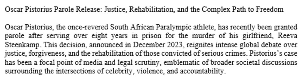 Pistorius’s case is more than just a singular event; it is a lens through which to examine the broader dynamics of justice systems, media narratives, and societal values. It compels us to reflect on how we balance the need for accountability with the potential for redemption.