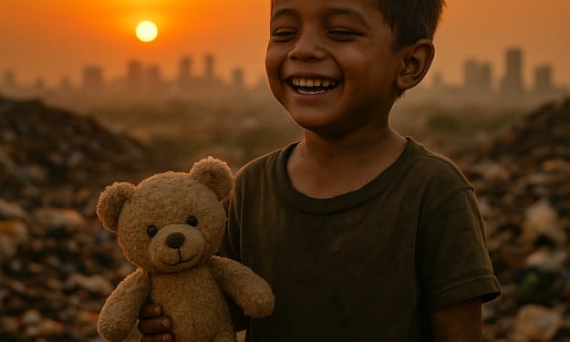 “A forgotten boy, a broken bear, and a smile that lit up the world.” The sun dipped low on the horizon, casting a golden-orange glow over the wasteland that stretched for miles. A soft breeze whispered through the trash-strewn mounds, stirring old papers and plastic wrappers as if they carried forgotten secrets. Amidst this chaos stood a small boy—barefoot, dusty, and thin, yet smiling as though he had everything.