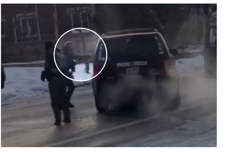 After the officer fires his first shot, he can be seen standing on the car’s left side.