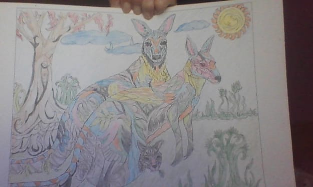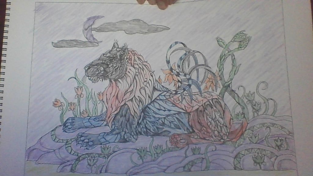 Lions, tigers, and bears oh my! Here is a picture I colored with my colored pencils with a brave lion lying on a large, gray rock with green plants growing around him. I was trying for a more traditional yet whimsical view using blues, reds, oranges, and gray and black for the head. The is a quarter moon out for this night scene, so the moon is gray and the clouds around the clouds are black with the sky area light gray. Please share your thoughts on this brave lion.