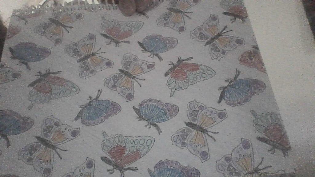 "Butterflies" is a page from an adult coloring book. I used crayons to fill in the designs. This could be a worksheet for preschool or kindergarten children or even could be used in a special education classroom. The children can count and match the colors of each butterfly. How many orange butterflies? How many blue butterflies? Count the antennas of all the butterflies. It could also lead to a nature/science lesson. Please comment.