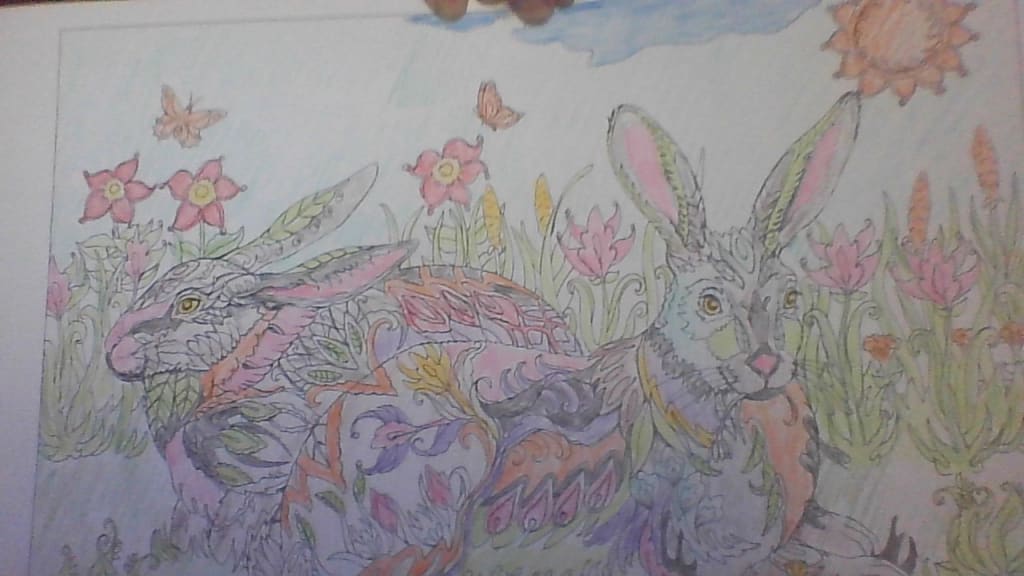 Here is a picture I colored with my colored pencils. I tried to get a festive feel kind of like Easter with the blues, pink, oranges and greens. If you notice I gave the sky area a shading of light blue with a bright orange sun. The flowers I decided to color pink, red, orange, and blues and purple.