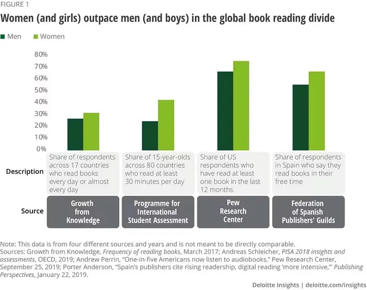 Links to evidence and further info: https://geediting.com/world-reading-habits-2020/ https://www2.deloitte.com/us/en/insights/industry/technology/technology-media-and-telecom-predictions/2022/gender-gap-in-reading.html https://www.dazeddigital.com/life-culture/article/63149/1/why-dont-straight-men-read-novels-fiction-masculinity-influencers-sigma https://thred.com/newsletters/gen-zers-are-causing-a-boom-in-romance/ https://www.theguardian.com/commentisfree/2020/jan/04/lit
