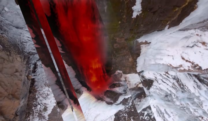 Well, that’s pretty spot on …until your eye gets caught by a blood-red waterfall spilling from the icy walls!