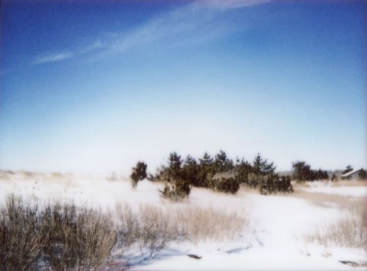 Someone has already made a path here, so I follow the deep footfalls cast by snow. Still, I don’t touch sand and keep mindful of slick surfaces as I wind the path past the iced over marsh and back up the dunes to the copse of maritime pine stark against the bright white and pale, sleeping grass. A muted green yet green nonetheless among the hibernating things.