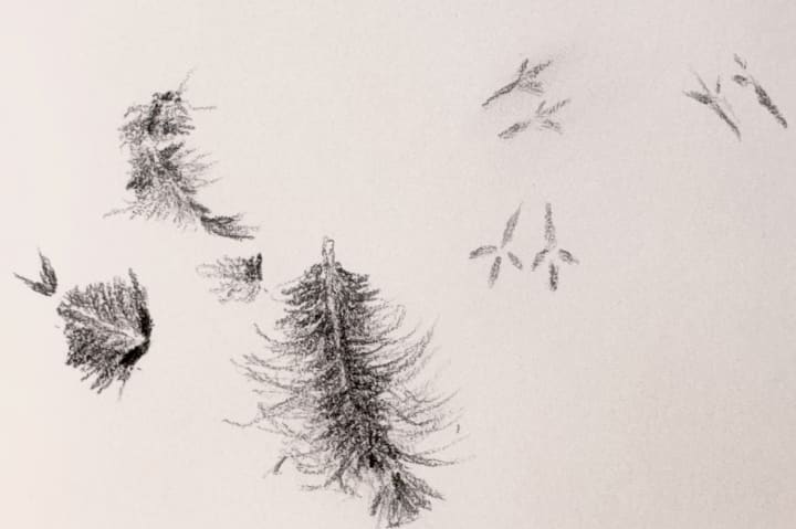 On the ground is contrast of burst of dark feathers (an implication of violence in a quiet place) and delicate tracks gently imprinted of little birds hopping about. Unknown and unnamed to me, still they exist and still I document the evidence of their presence through photograph and graphite. They are not here but they will return when this place is free of me.