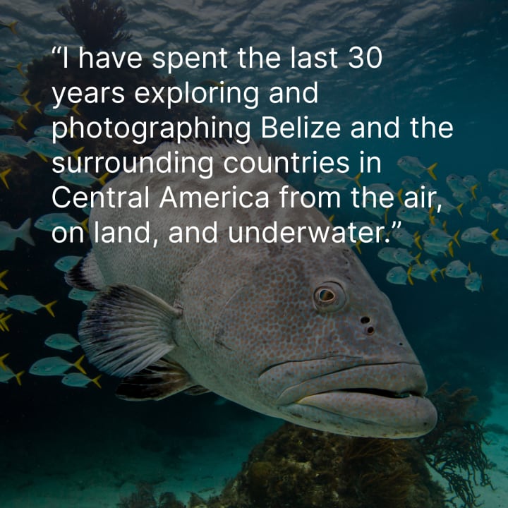 I soon found myself back in Belize again managing the Smithsonian Institution’s research station on Carrie Bow Caye. There, I met a young Belizean woman and woke up 5 years later married with three children. I have spent the last 30 years exploring and photographing Belize and the surrounding countries in Central America from the air, on land, and underwater.