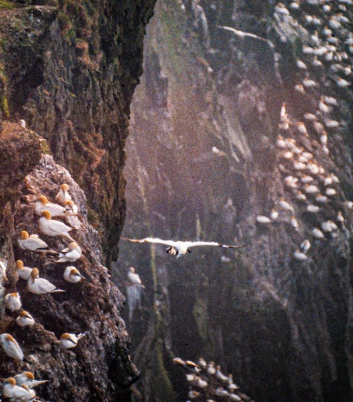 I was able to hitch a ride on the once-a-week helicopter and spent the week photographing the magnificent nesting cliffs crowded with gannets, shearwaters, kittiwakes, and puffins among others. To have millions of birds and a remote island to myself for a week was heaven.