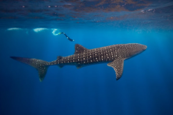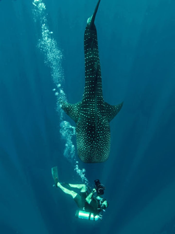 Below, a single huge dark shape swam, in what looked like slow motion, towards the snapper school. With its mouth wide open the whale shark curved over the top of them, sucking in the spawn, then returned to the deep, completely oblivious to the divers. Then another shark appeared and did the same thing. Then two more, then three, and soon the water was full of whale sharks feeding on the cloudy spawn in the water.