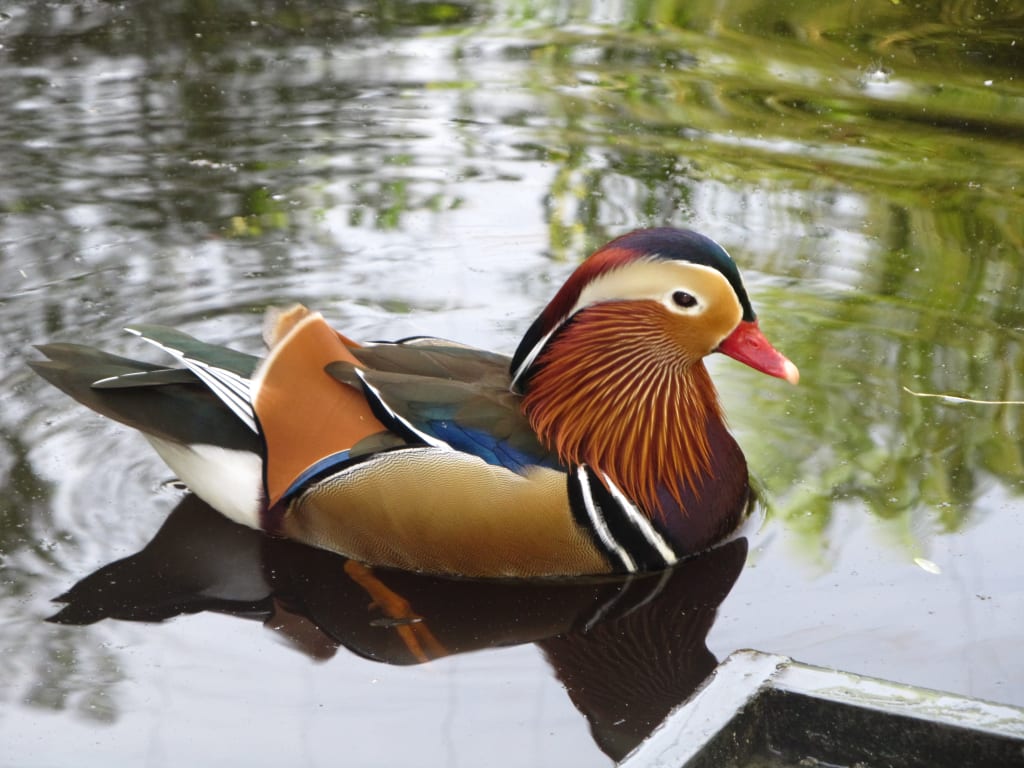 The bird was unlike any other I'd ever seen, its plumage brandished a warm orange glow like burning wood, with broad strokes of blue, green, white, brown, and red. Its cousin, the American Wood duck, now seemed unremarkable in comparison to this vibrant, glowing waterfowl.