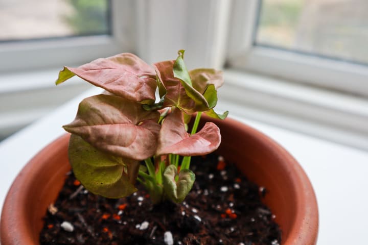 5. Arrowhead Vine: Arrowhead Vine (Syngonium podophyllum) is a climbing plant that has arrow-shaped leaves that come in various shades of green, white, and pink. It prefers bright, indirect light and moist soil, and can be trained to climb up walls or trellises. It's a low-maintenance plant that can add a pop of color to your apartment.