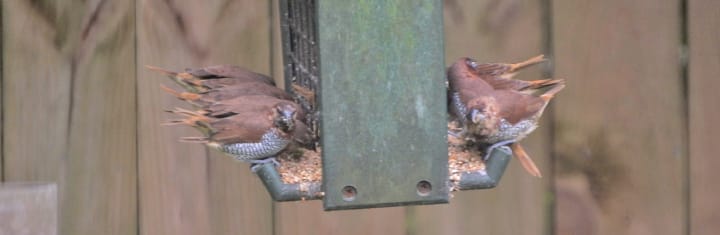 Are Scaly-Breasted Munias now breeding in Louisiana? Specifically, are they breeding in or around my yard? Much earlier in the spring, I was getting visits from a pair, rather than from a flock. Then they went quiet.