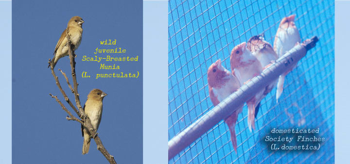 I watch. I wait. And I wonder. Maybe you should be watching your feeders too. The image below compares wild juvenile Scaly-breasted Munias (one of those Little Brown Jobs without much in the way of field marks) to some of my domestic-bred Society Finches. In bad light, or if you only catch a glimpse, you could confuse your new Spice Finch overlords with lost Societies, but you'll figure it out eventually.