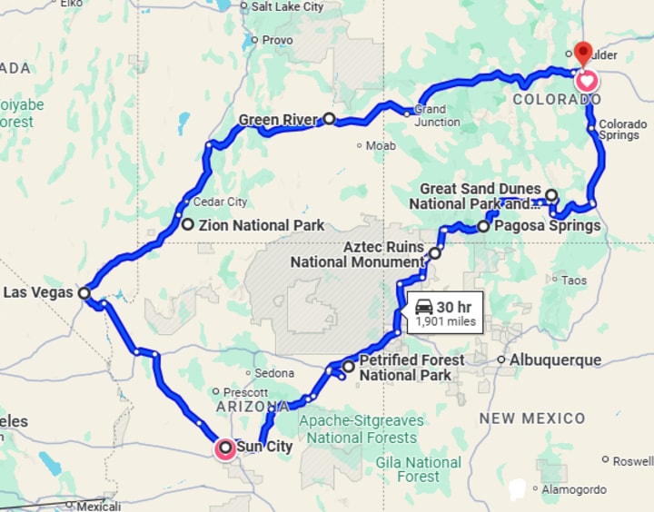 A few years ago, I made it one of my goals to go see at least one new National Park every year. This year I decided to up my game, and after spending some time on Google Maps, I figured out that I could essentially drive in a large circle through Colorado, New Mexico, Arizona, Nevada and Utah, and visit several National Parks, monuments, state parks and as a nice halfway break, Las Vegas.