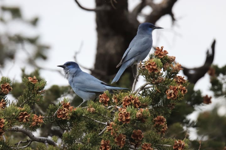 I sat for some time, enjoying a packed lunch, and watched families and hikers enjoy the sandy swoops and bumps, before heading out for my final destination of the day. On my way out, I pulled over to get a final picture of the dunes, only to hit some very lucky timing, at least for a birder. When I rolled down the window to get the photo, I heard a series of calls from an unfamiliar bird, seeing several blue blurs darting around a nearby tree. I used my Merlin app to identify the sounds and was absolutely delighted to find that I had stumbled upon some pinyon jays, the only Colorado jay I had not yet observed.